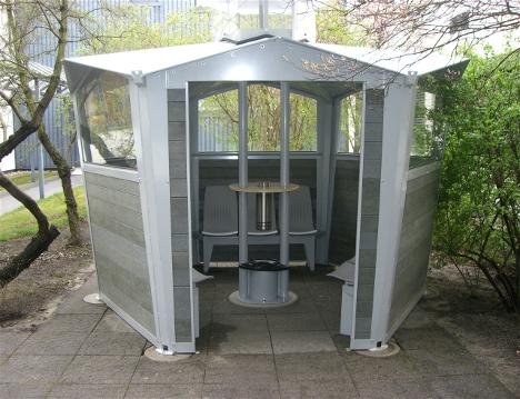 „Trend M” dohányzópavilon 10 személyig (290 x 250 x 15 személyig (380 x 330 x 20 személyig (547 x 474 x Kiszerelés: - futurisztikus, hatszögletű forma padláserkéllyel és fénykupolával - horgonyzott porfestésű acél vázszerezettel, keretekkel és kupolával - törésálló polikarbonát ablakokkal, és újrahasznosított anyagból készült falakkal - óriáscentrifugás hamutartóval és asztallappal szállítva - az M-medellnél ülő-támasztó gerendákkal szállítva - a mozgássérült, kerekesszékes használatra is alkalmas - Összeszerelhető állapotban szállítva. Kérésre az összeállítást mi magunk is elvégezzük. - szerelés faszeges alapzattal az alapterveink szerint. Opcionálisan szállítható: infravörös melegítővel, szükség esetén infravörös szenzorvezérlésű világítással |